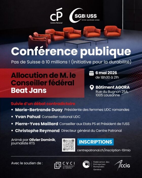 Venez assister à la conférence publique « Pas de Suisse à 10 millions » organisée pas le Centre Patronal et l’Union syndicale suisse USS le mercredi 6 mai à l’AGORA à Lausanne.